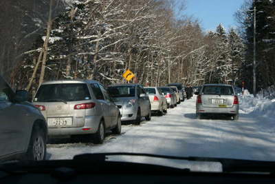 石山の踏切に向かう道はえんえん「鉄」車が停まっています。