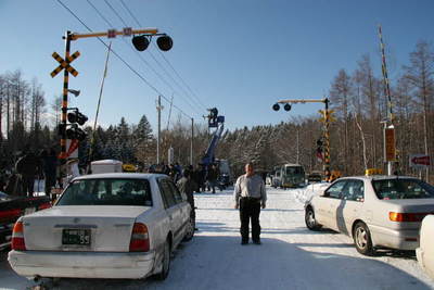 石山の踏切、タクシーも居るし高所作業車をチャーターした者も居ます。